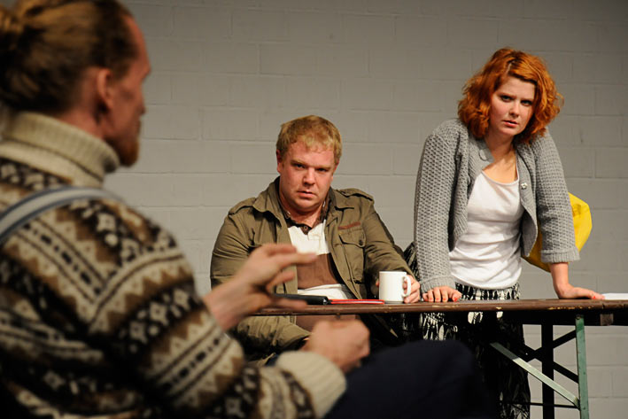 Andre Scioblowski, Carsten Caniglia, Alica Weirauch in: „Und keiner will der Kapitalist sein ...“ – Zement. Probe Revolution; Regie: Markus Schlappig, Theater Arbeit Duisburg 2008, Ringlokschuppen Mülheim a.d.Ruhr