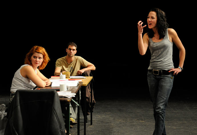 Alica Weirauch, Alessandro Nania, Katinka Mache in: „Und keiner will der Kapitalist sein ...“ – Zement. Probe Revolution; Regie: Markus Schlappig, Theater Arbeit Duisburg 2008, Ringlokschuppen Mülheim a.d.Ruhr
